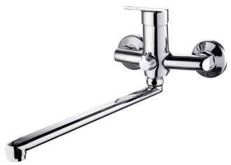 Функциональный однорычажный смеситель для ванной комнаты с длинным поворотным изливом обладает стильными округлыми формами. Наличие длинного поворотного излива делает модель универсальной: она используется для обеспечения водой как ванны, так и раковины – актуально в небольшом санузле.