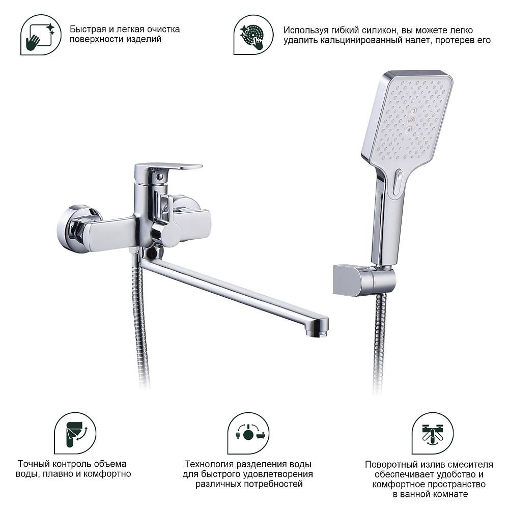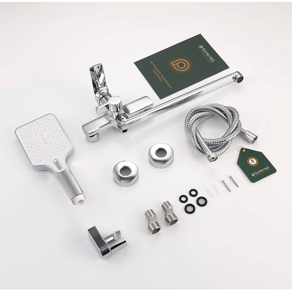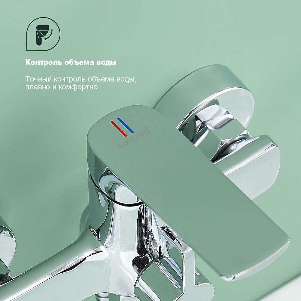 Смеситель для ванны Splenka S06.22 универсальный. Цвет: хром. Материал: латунь. Управление: однорычажное. Механизм: керамический картридж. Излив: поворотный. Стандарт подводки: G 1/2. Аэратор. Переключатель ванна/душ. Монтаж: на стену. Душевая лейка - 3 режима.