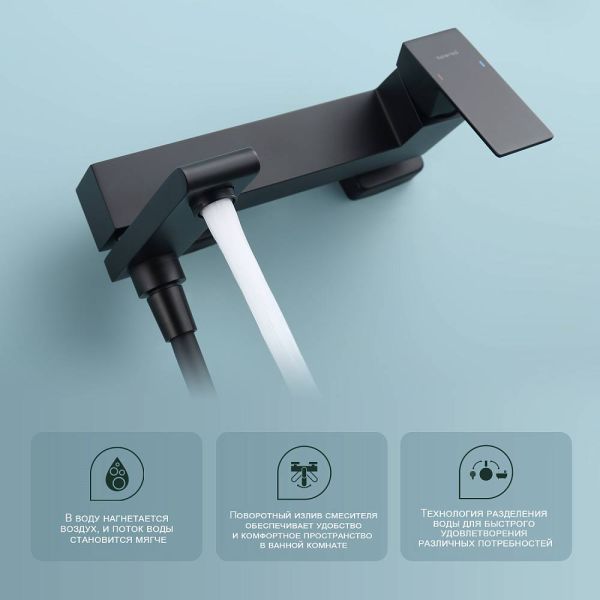 Смеситель для ванны Splenka S224.30.06 с душевым гарнитуром. Цвет: черный. Материал: латунь. Управление: однорычажное. Механизм: керамический картридж. Излив: поворотный. Аэратор. Стандарт подводки: G 1/2. Отверстия для монтажа: 2. Количество режимов струи: 3. Монтаж: на стену.