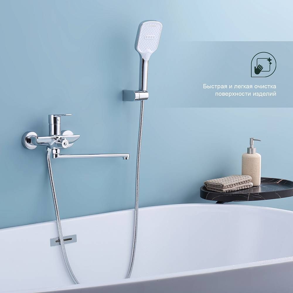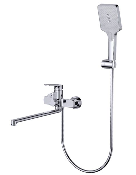 Смеситель для ванны Splenka S30.22 универсальный. Цвет: хром. Материал: латунь. Управление: однорычажное. Механизм: керамический картридж. Излив: поворотный. Стандарт подводки: G 1/2. Аэратор. Переключатель ванна/душ. Монтаж: на стену. Душевая лейка - 3 режима.