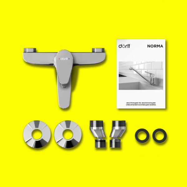 Смеситель Dorff Norma для ванны и душа, D1010000Смеситель для ванны и душа: излив фиксированный 81 мм, керамический картридж, в комплекте эксцентрики и декоративные розетки, выход 1/2 для душевого шланга.