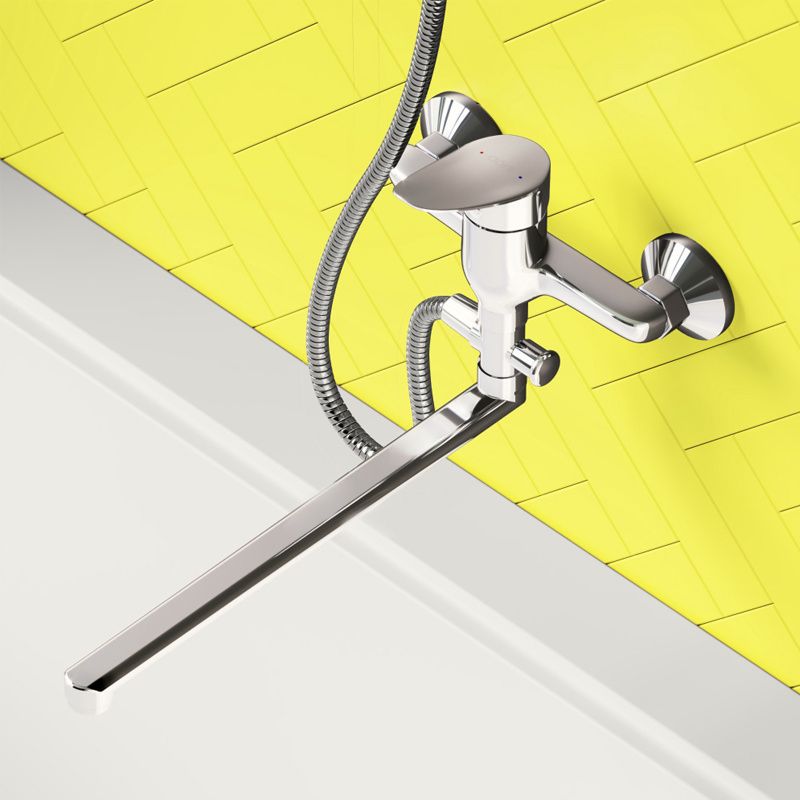 Смеситель для ванны и душа: излив поворотный, керамический картридж, в комплекте эксцентрики и декоративные розетки, душевой шланг 1500 мм, держатель (на два положения) и душевая лейка d 95 мм (1 режим).