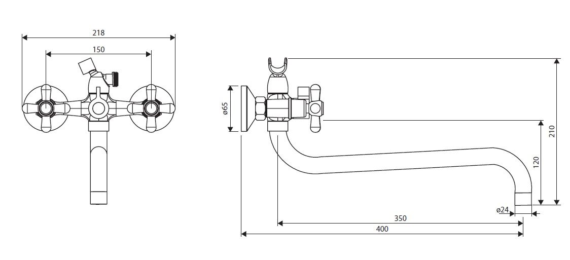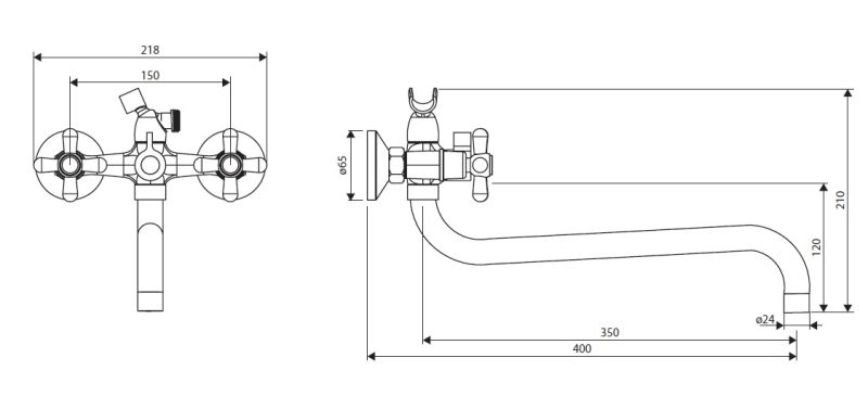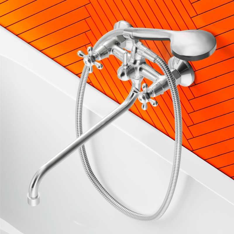 Смеситель для ванны и душа: излив поворотный, керамический картридж, в комплекте эксцентрики и декоративные розетки, выход 1/2 для душевого шланга, шланг 1500 мм, лейка Ø 95 мм. (1 режим).