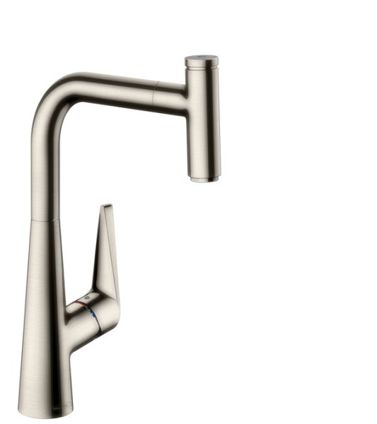 Смеситель для кухни 300, однорычажный, с выдвижным изливом Hansgrohe Тalis Select S 72821800 по выгодной ценеХарактеристики продукта:-ComfortZone 300-угол поворота излива: регулировка на 2 уровня, на 110° или 150°-обычная струя-кнопка Select: для комфортного включения/выключения воды-магнитная система крепления душа MagFit-подходит для проточных водонагревателейКупить смеситель Hansgrohe Тalis Select S 72821800 для кухни Вы можете у нас на сайте Gidro-butik
