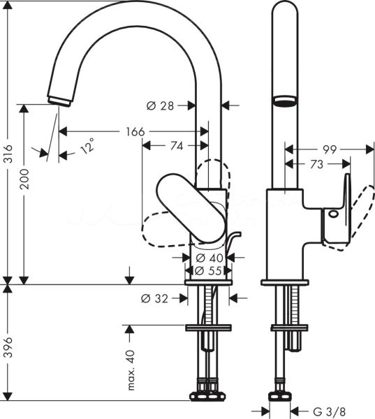 Угол поворота излива: регулировка на 2 уровня на 120 градусов или 360 градусов.