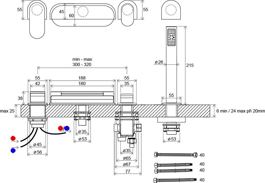 - исполнение: устанавливается на ванну с широким и горизонтальным бором; врезной на 4 отверстия; с лейкой