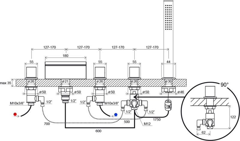 - исполнение: устанавливается на ванну с достаточно широким и горизонтальным бортом; врезной на 5 отверстий; с лейкой.