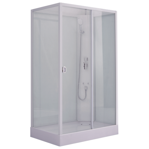 Прямоугольная, без пара. без крыши, с акриловым поддоном высотой 150 мм, верхним и ручным душем, стекла 8мм прозрачные, но по желанию могут быть тонированные, матовые, белые. Без гидромассажа спины. Простая и быстрая установка, сборка без силикона.