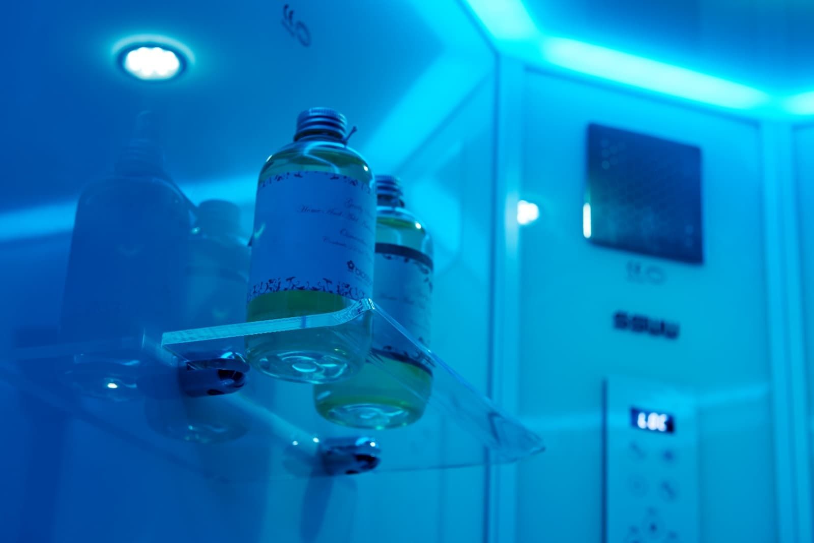 Центральная панель – белое стекло с накладкой из нержавеющей стали с силиконовыми форсунками и смесителем из латуни;