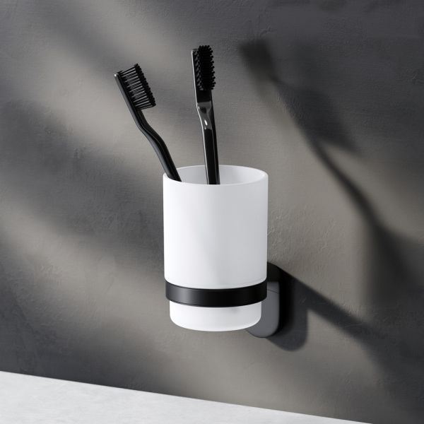 Стакан с настенным держателем в глубоком черном цвете из коллекции Х-Joy, чтобы самое необходимое всегда было под рукой. Идеально впишется в современную ванную комнату и будет радовать глаз каждый день.- Матовое стекло отличается прочностью и лёгкостью в уборке.- Держатель плотно прилегает к стене и не расшатывается за счёт специального шурупного крепления.- Уплотнительный элемент между стеклянным стаканом и его держателем надёжно фиксирует приспособление.- Выполнен в современном дизайне, легко комбинируется с другими продуктами бренда.