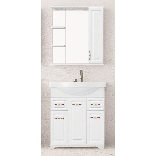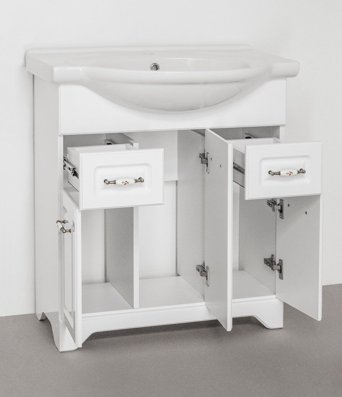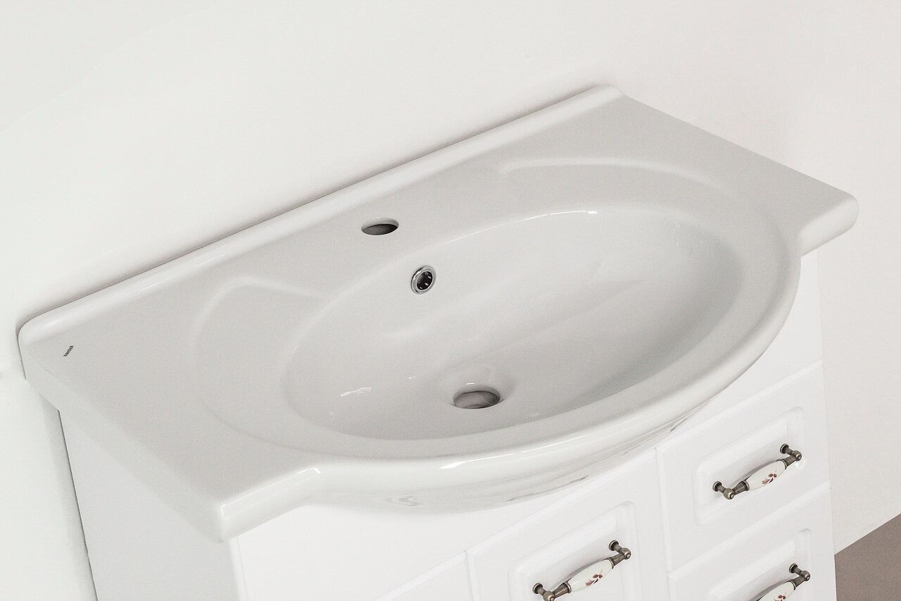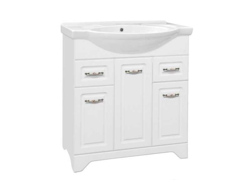 Тумба напольная бренда "Style Line" коллекции "Олеандр-2" классического дизайна, декорированная ручками с керамическими вставками "под бронзу" с изящным рисунком. Направляющие полного выдвижения Hettich; сборка изделия с помощью эксцентриковых стяжек Hafele; все материалы полностью влагостойкие. Данная тумба предусматривает открытую подводку воды