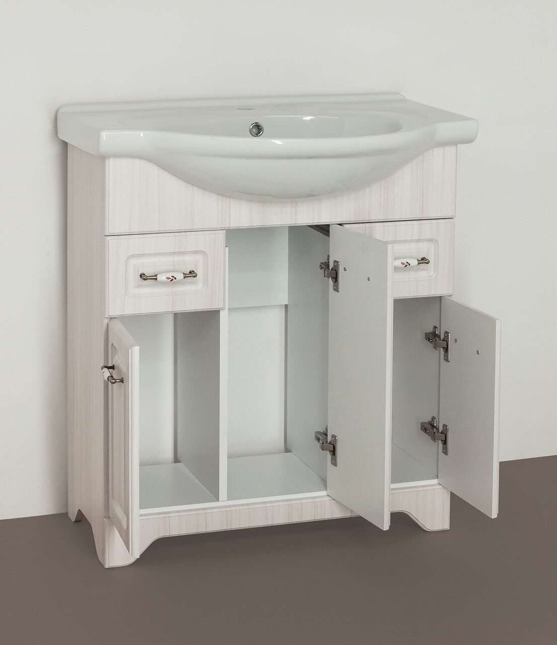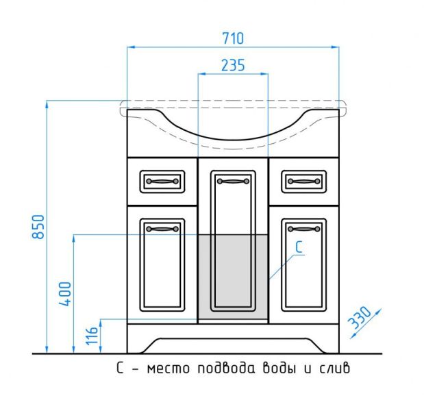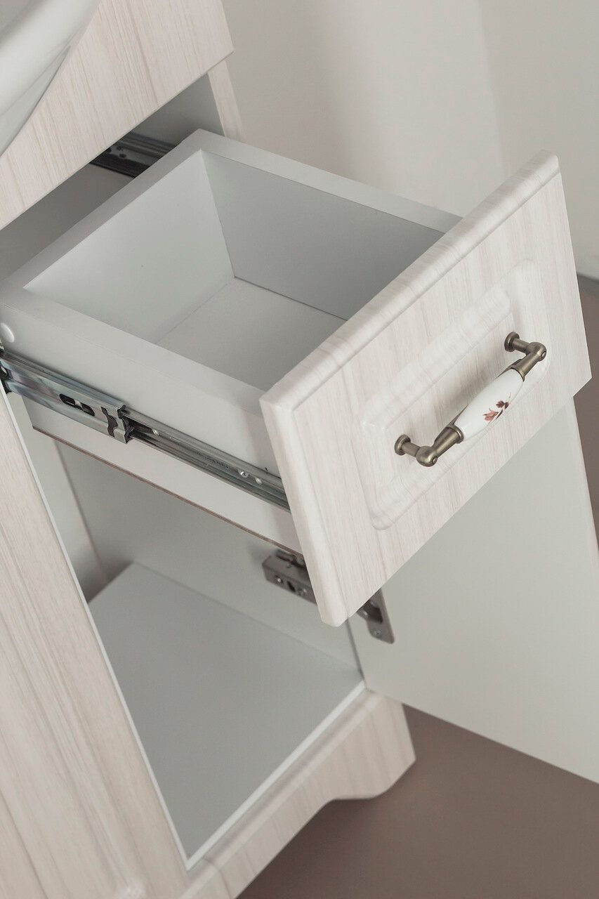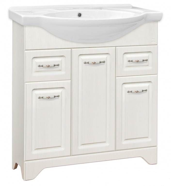 Тумба напольная бренда "Style Line" коллекции "Олеандр-2" классического дизайна, декорированная ручками с керамическими вставками "под бронзу" с изящным рисунком. Направляющие полного выдвижения Hettich; сборка изделия с помощью эксцентриковых стяжек Hafele; все материалы полностью влагостойкие. Данная тумба предусматривает открытую подводку воды
