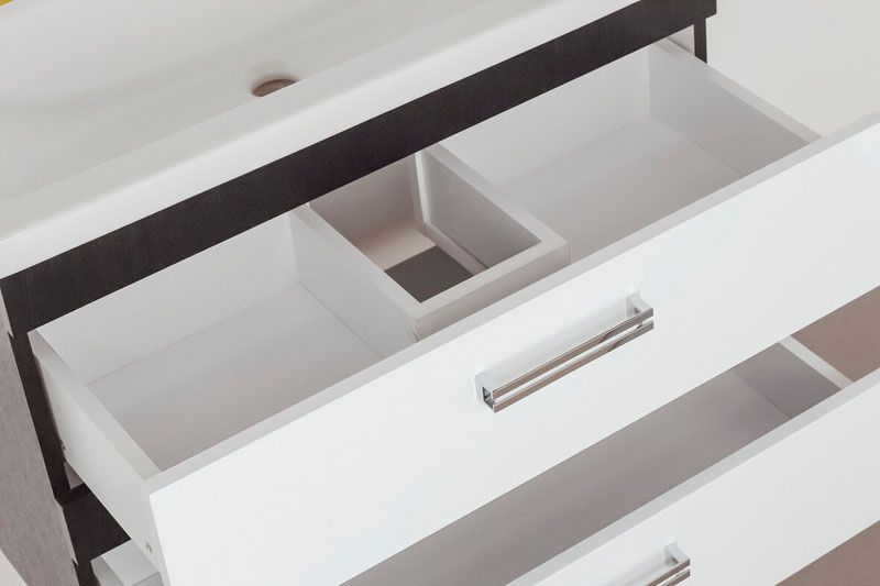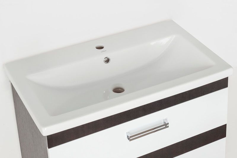 Тумба подвесная Style Line коллекции "Сакура" с декоративными ручками и доводчиками Hettich. Фурнитура - хром. Данная тумба предусматривает открытую подводку воды. Сочетание белого глянца и венге в данной коллекции придает ей строгость и уникальность форм. Боковины изделий в пленке в цвет фасадов