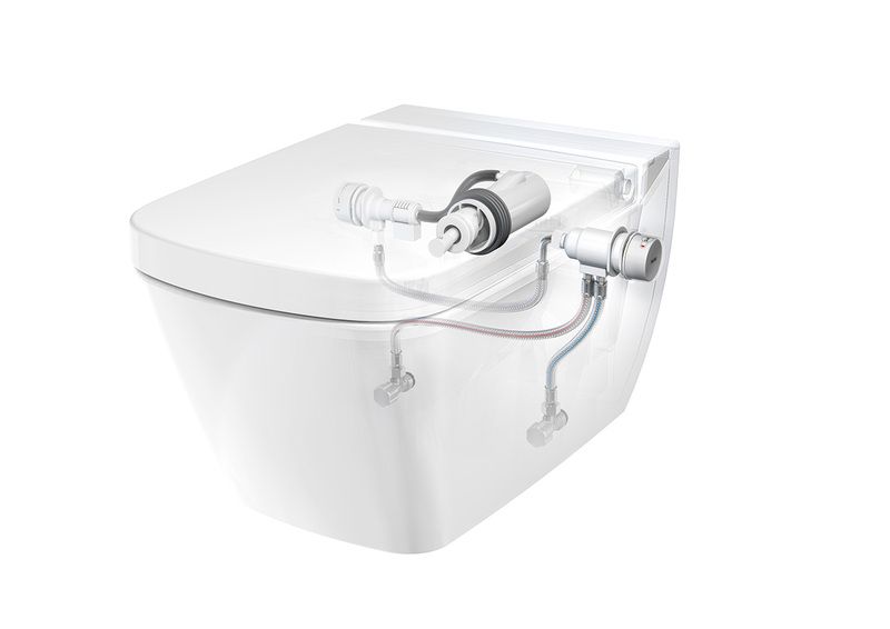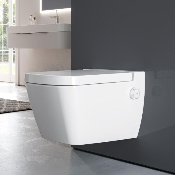 Подвесной безободковый унитаз со встроенным гигиеническим душем. Гигиенический душ функционирует без использования электричества, необходимо подключение к горячей и холодной воде. Функции биде: • Интуитивно понятная установка температуры и напора воды с помощью встроенных поворотных регуляторов • Регулировка объема подачи воды до 5,6 л/мин • Индивидуальная регулировка температуры воды (10–38 °C) • Самочистящиеся форсунки гигиенического душа • Сменные форсунки • Соответствует DIN EN 1717 • Минимальное рабочее давление 1 бар (макс. 10 бар) Особенности унитаза: • Подвесной унитаз • Компактная конструкция — расстояние от стены 540 мм, установочное расстояние между шпильками 180 мм • Скрытые крепежные элементы и скрытые подсоединения к системе водоснабжения • Безободковая чаша унитаза со встроенной защитой от брызг • Установленное крепление для сидения унитаза с крышкой • Материал: сантехническая керамика • Оптимальная с гигиенической точки зрения конструкция унитаза с минимальным количеством углов, кромок и соединений • Соответствует DIN EN 997 • Размеры (ш x в x г): 358 x 350 x 540 мм Комплект поставки: • Унитаз, включая крепежные элементы скрытого монтажа • Предварительно установленное крепление для сидения унитаза • Предварительно установленные управляющие регуляторы температуры и напора воды • Армированные шланги для подсоединения к системе водоснабжения для стандартных угловых клапанов Дополнительно приобретается: • Сидение унитаза с крышкой TECEone (арт. 9700600) Примечание. Для функции биде на этапе установки необходимо предусмотреть подключение к системам горячего и холодного водоснабжения (см. комплекты установки). Для установки с TECElux необходимо выбрать соответствующую нижнюю стеклянную панель (арт. 9650109 или 9650110).