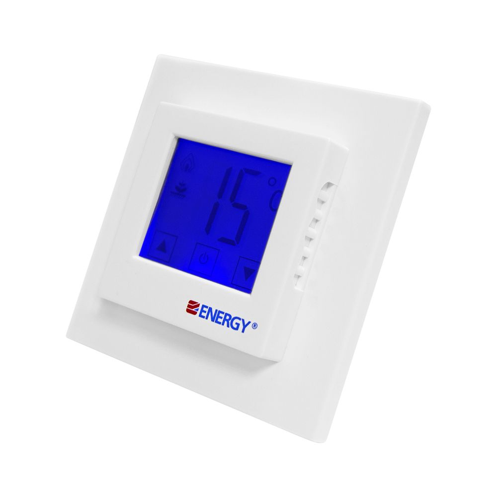 Energy TK07 - электронный терморегулятор с крупным сенсорным жидкокристаллическим дисплеем 40 мм х 35 мм и выносным датчиком температуры пола. Предназначен для скрытого утопленного монтажа с использованием стандартной монтажной коробки. Размеры регулятора соответствуют европейским стандартам.Диапазон регулирования температуры: +5°С - +40°С. Высокая точность установки температуры 0,5°С существенно сокращает время работы тепловой системы и снижает расходы на потребляемую электроэнергию.Управление термостатом осуществляется тремя сенсорными кнопками на поверхности жидкокристаллического дисплея. Также на дисплее крупными символами отображается информация о режимах работы, текущей и заданной температуре. При нажатии кнопок автоматически загорается синяя неоновая подсветка, поэтому терморегулятором легко управлять даже в темном помещении.Терморегулятор Energy TK07 имеет класс защиты IP 21, подходит для помещений с повышенной влажностью.Данный терморегулятор совместим с рамками других производителей, таких как Schneider, Gira, Jung и ABB.