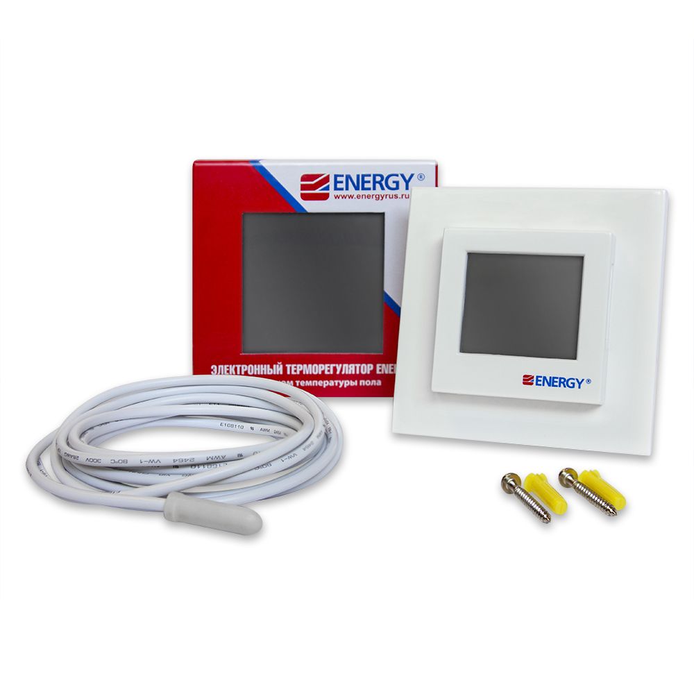 Электронный программируемый терморегулятор Energy TK08 с крупным сенсорным жидкокристаллическим дисплеем и выносным датчиком температуры пола. Предназначен для скрытого утопленного монтажа с использованием стандартной монтажной коробки.Диапазон регулировки температуры: от +5°С до +40°С. Точность настройки 0,5°С и функция программирования снижают расходы на потребляемую электроэнергию на 60-80%.Оснащен функцией программирования с возможностью установки четырех графиков работы теплого пола для рабочих дней недели и двух для выходных дней. Для каждого режима устанавливается время работы и нужная температура. Минимальное время работы каждой программы - 10 минут.Терморегулятор дополнен функцией «ранний старт» - используя данные за предыдущий день работы, прибор вычисляет время, за которое пол нагреется до заданной температуры. На величину этого времени корректируется запуск теплого пола.Управление с помощью пятью сенсорных кнопок. На экране отображаются данные о режиме работы, текущей температуре, дне недели и времени. При нажатии кнопок автоматически включается неоновая подсветка синего цвета.Корпус терморегулятора защищён от конденсата (класс защиты IP 21). Подходит для установки в помещениях с повышенной влажностью.Данный терморегулятор совместим с рамками других производителей, таких как Schneider, Gira, Jung и ABB.