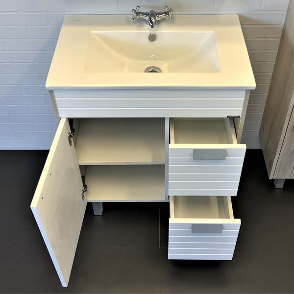 Напольная тумба-умывальник с одной створкой и двумя ящиками оснащенными системой плавного закрывания. Фасады с горизонтальной фрезеровкой и покрыты белой матовой эмалью. Боковины тумбы из влагостойкого ЛДСП - дуб дымчатый.