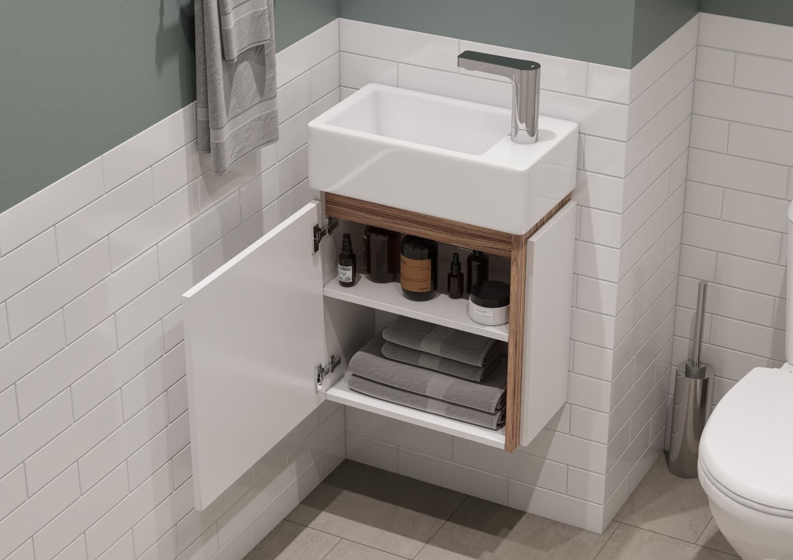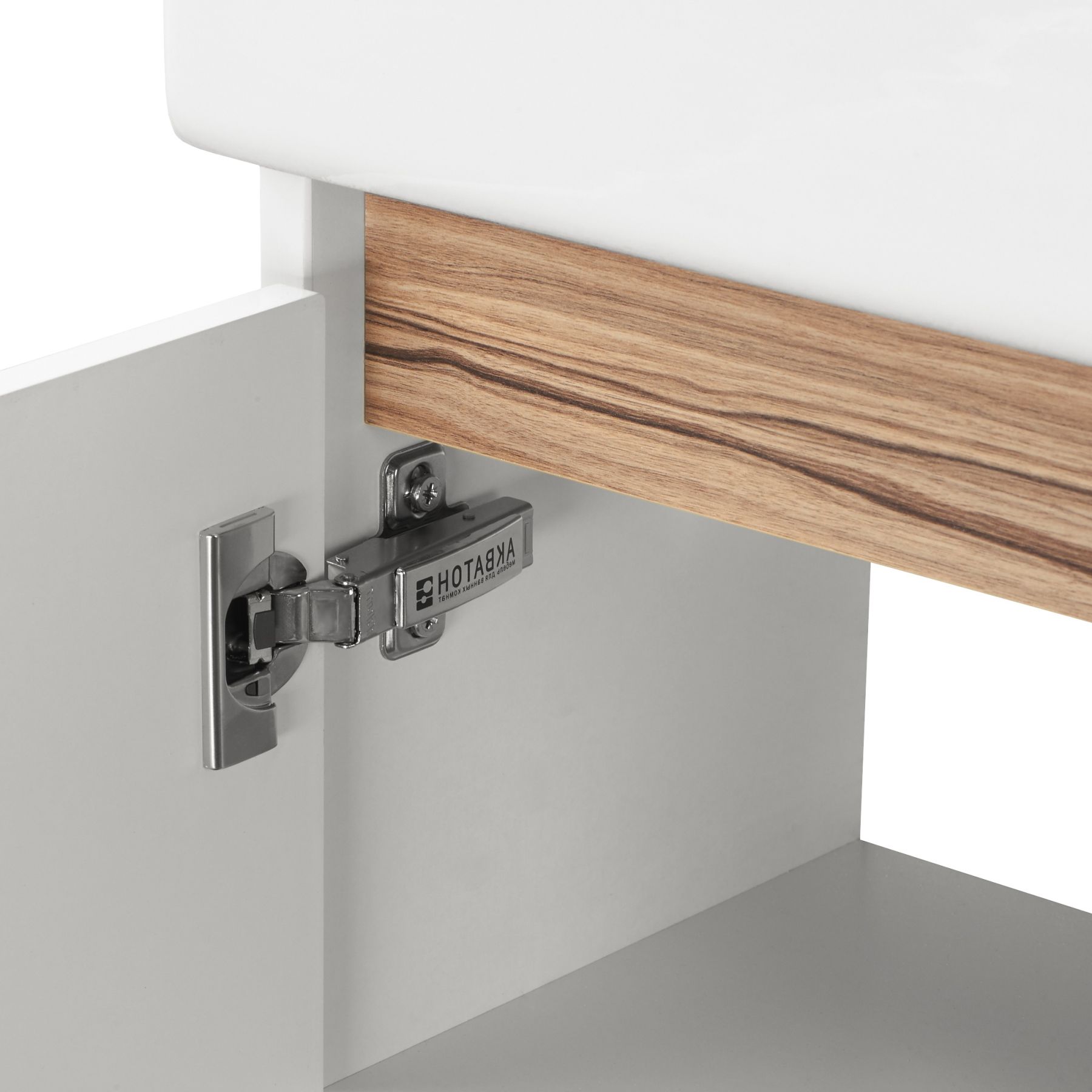 - Подвесная тумба с белыми глянцевыми накладками, благодаря которым фасад легко открывается без ручки