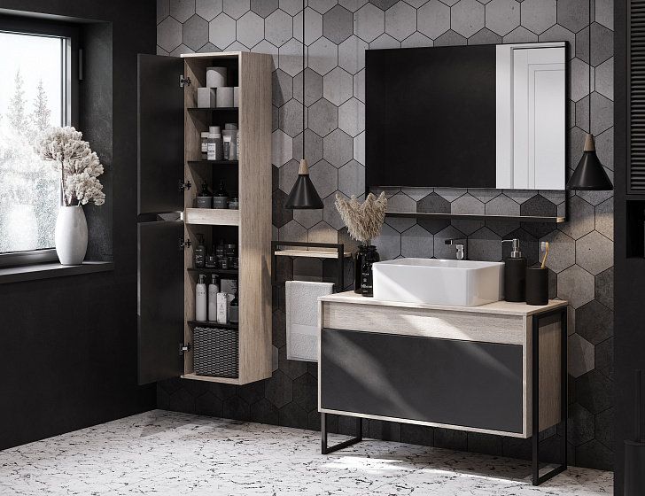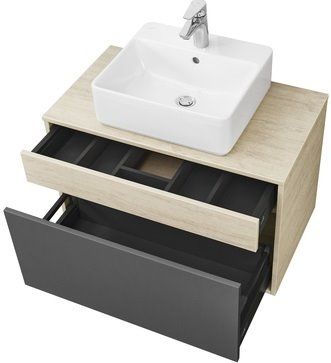 Модуль 80 коллекции Лофт Урбан функционально состоит из двух ящиков полного выдвижения. Верхний ящик тумбы комплектуется внутренней организацией пространства: в нем очень удобно хранить небольшие аксессуары и принадлежности. Вместительный нижний высокий ящик подойдет для более крупных предметов. Функция полного выдвижения ящиков и система открывания push-to-open делают использование тумбы особенно комфортным. Подвесной модуль может комплектоваться различными по размеру и дизайну металлическими черными опорами, высокими и низкими, которые крепятся непосредственно под модуль, кроме того, доступен вариант установки модуля и без опор. Корпус тумбы выполнен из влагостойкой ламинированной ДСП в цвете дуб орегон с текстурой натурального дерева, выгодно подчеркнутым фасадами из МДФ в пленке антрацит с эффектом soft touch.