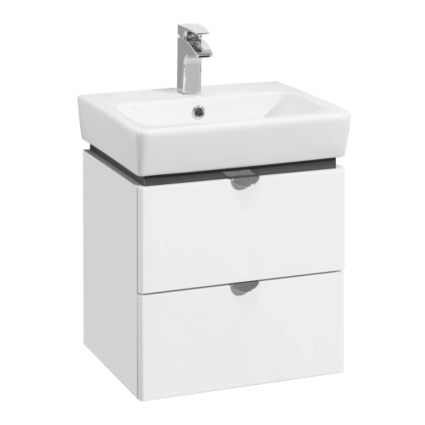 Компактная тумба Скай PRO 50 от AQUATON в современном стиле гармонично сочетает ультрабелые глянцевые фасады с декоративной вставкой в цвете серый кашемир - элегантное и практичное решение для удобной организации пространства в небольших ванных комнатах. Корпус модели из влагостойкой ЛДСП и фасады из высококачественной МДФ покрыты белой полиэфирной краской ультрафиолетового отверждения, которая гарантирует безупречный внешний вид, а также прочность и долговечность. Тумба имеет два выдвижных ящика, оснащенных направляющими с интегрированной системой плавного закрывания. Белоснежные глянцевые фасады подчеркивают эргономичные хромированные ручки. Для комплектации тумбы идеально подходит раковина Нео от бренда Santek.