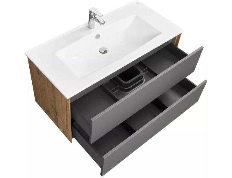 Тумба Сохо 100 функционально состоит из двух вместительных ящиков, оснащенных системой push to open, обеспечивающей надежное, комфортное и бесшумное закрывание. Фасады изделия – МДФ в пленке графит с эффектом soft touch, корпус – ламинированная влагостойкая ДСП Дуб веллингтон. Верхний и нижний ящики оснащены системой организации пространства, которая позволяет содержать косметические средства в идеальном порядке. Дополняет тумбу стильная раковина Элина от бренда Santek с удобной чашей. Все внутренние детали тумбы выполнены в тон фасадов – цвета антрацит