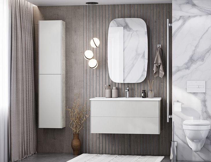 Тумба Сохо 100 функционально состоит из двух вместительных ящиков, оснащенных системой push to open, обеспечивающей надежное, комфортное и бесшумное закрывание. Фасады изделия выполнены из МДФ в пленке в цвете галька серая, корпус из ламинированной влагостойкой ДСП слэйт. Верхний и нижний ящики оснащены системой организации пространства, которая позволяет содержать косметические средства в идеальном порядке. Дополняет тумбу стильная раковина Элина от бренда Santek с удобной чашей. Все внутренние детали тумбы выполнены в цвете антрацит.