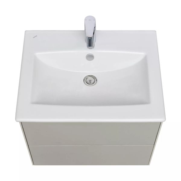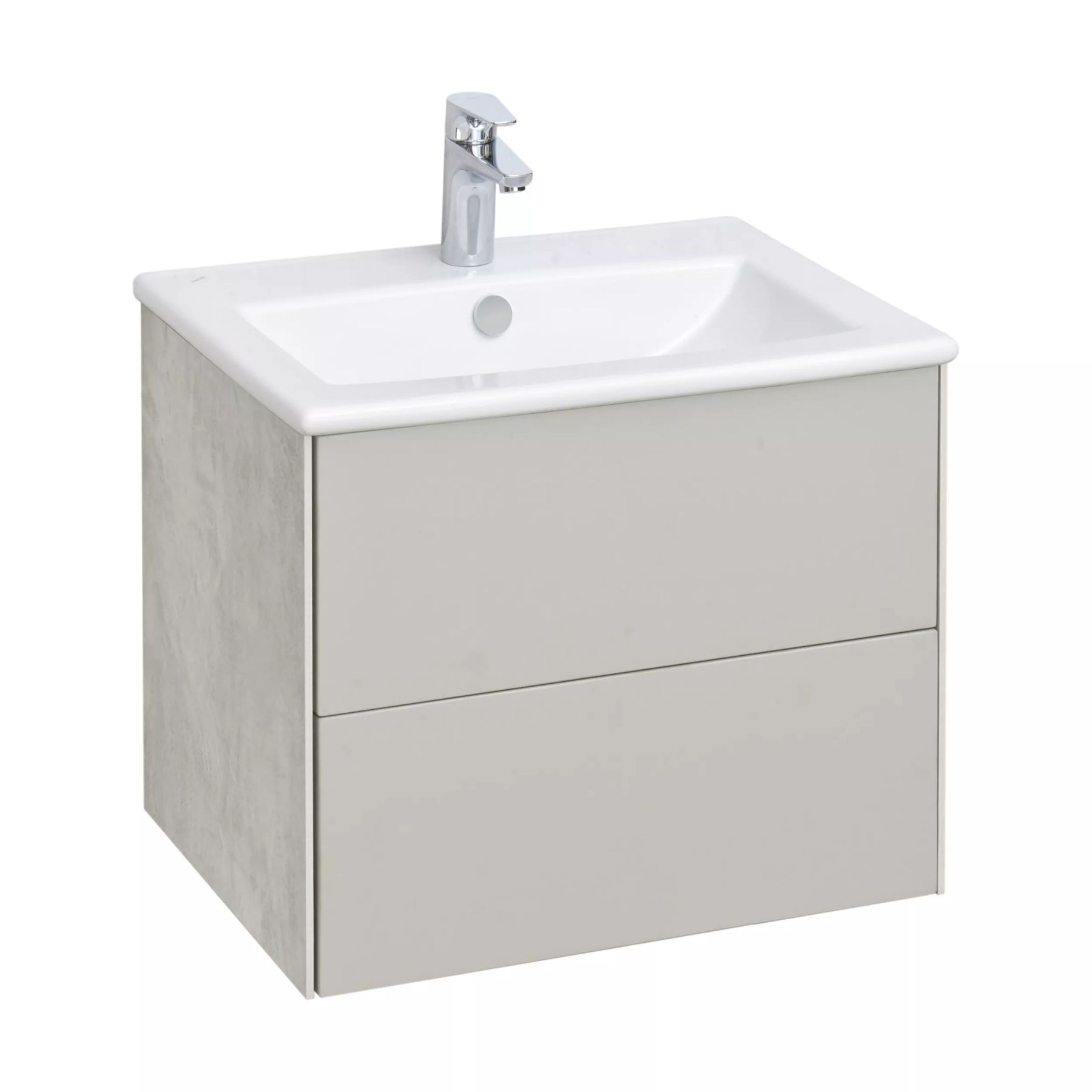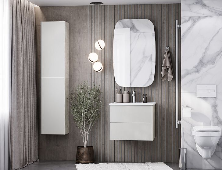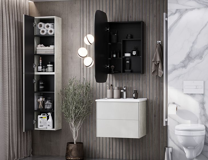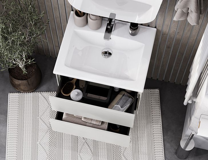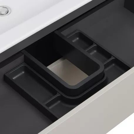 Тумба Сохо 60 функционально состоит из двух вместительных ящиков, оснащенных системой push to open, обеспечивающей надежное, комфортное и бесшумное закрывание. Фасады изделия выполнены из МДФ в пленке в цвете галька серая, корпус из ламинированной влагостойкой ДСП слэйт. Верхний и нижний ящики оснащены системой организации пространства, которая позволяет содержать косметические средства в идеальном порядке. Дополняет тумбу стильная раковина Элина от бренда Santek с удобной чашей. Все внутренние детали тумбы выполнены в цвете антрацит.