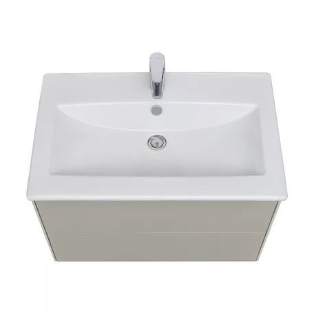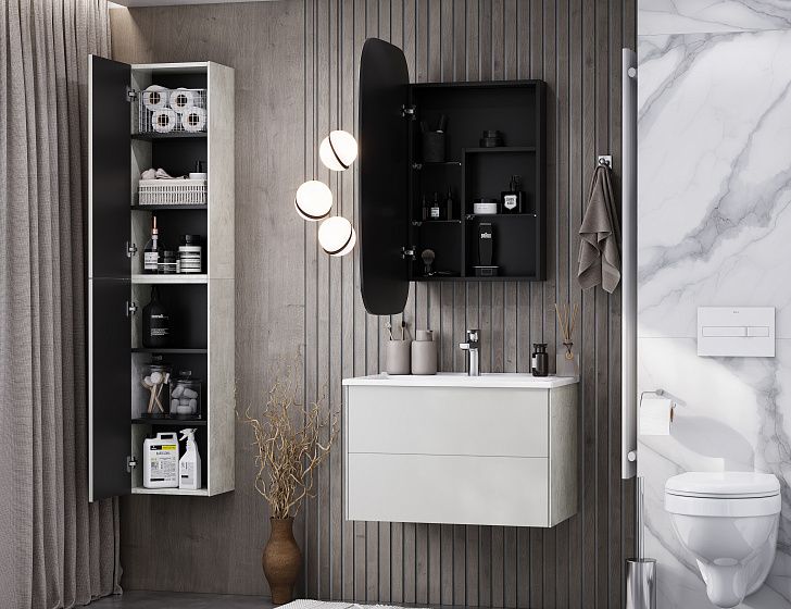 Тумба Сохо 75 функционально состоит из двух вместительных ящиков, оснащенных системой push to open, обеспечивающей надежное, комфортное и бесшумное закрывание. Фасады изделия выполнены из МДФ в пленке в цвете галька серая, корпус из ламинированной влагостойкой ДСП слэйт. Верхний и нижний ящики оснащены системой организации пространства, которая позволяет содержать косметические средства в идеальном порядке. Дополняет тумбу стильная раковина Элина от бренда Santek с удобной чашей. Все внутренние детали тумбы выполнены в цвете антрацит.