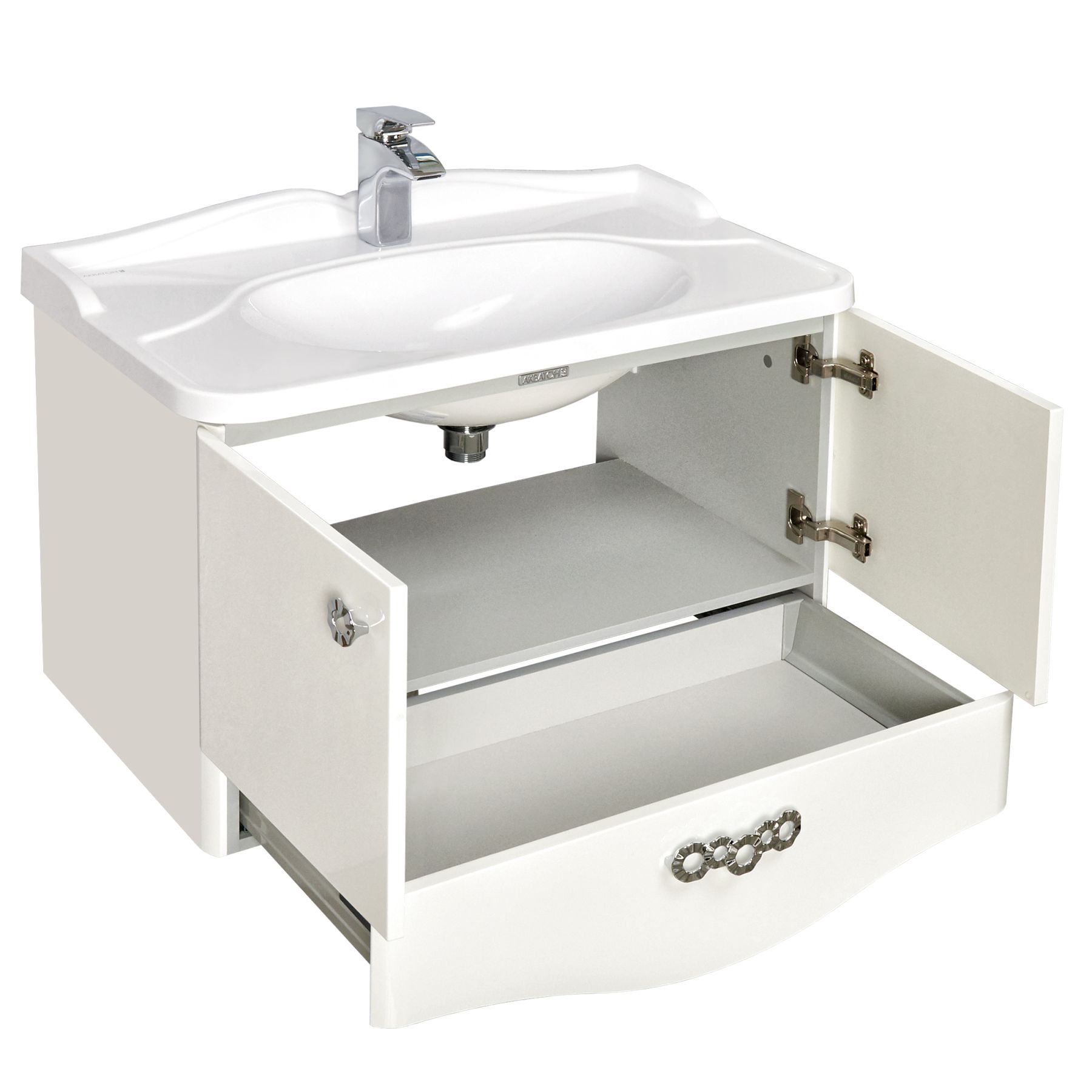 Тумбы Венеция выпускаются трех размеров и комплектуются изящными, но при этом очень практичными и удобными раковинами из литого мрамора.