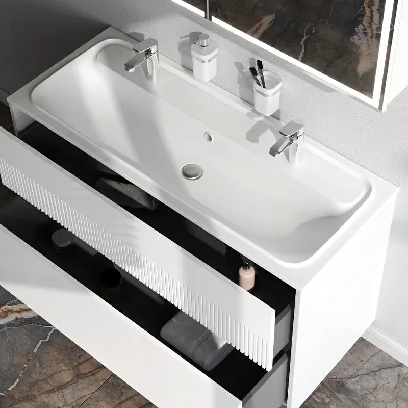 Дополните покупку тумбы уникальной широкой раковиной, интегрированной со столешницей. Раковина позволяет устанавливать два смесителя. Дизайн разработан немецкой студией Design3. Раковина выполнена из литьевого мрамора. Матовая поверхность раковины придает интерьеру ощущение уюта и комфорта. Размер раковины (Ш/Г/В): 1208x492x160 мм. Цвет раковины - белый.