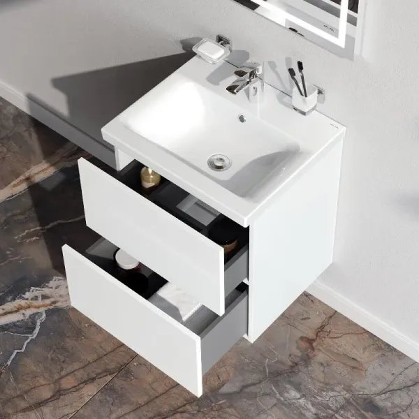 Тумба под раковину Am.Pm X-Joy M85AFSX06021WG напольная белый глянец 57.5 смТумба под раковину Am.Pm X-Joy 60 M85AFSX06021WG напольная белый глянцевый с отделкой под светлое дерево. 2 ящика (внутри в цвете антрацит с антискользящим эффектом). В верхнем ящике органайзер для хранения гигиенических принадлежностей. Раковина приобретается отдельно (см. дополнительную комплектацию). Комплектация: тумба под раковину, комплект ножек, инструкция
