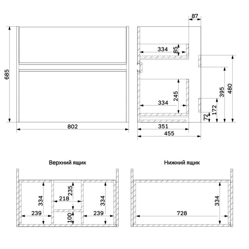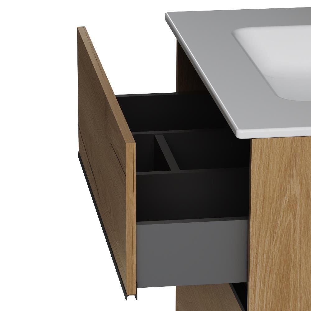 Два вместительных ящика на направляющих Soft-close скрытого монтажа, которые обеспечивают плавное и бесшумное открывание и закрывание - использование тумбы максимально комфортное. Элегантная черная акцентная металлическая профильная ручка придает изделию современный и стильный вид, подчеркивая его уникальность.