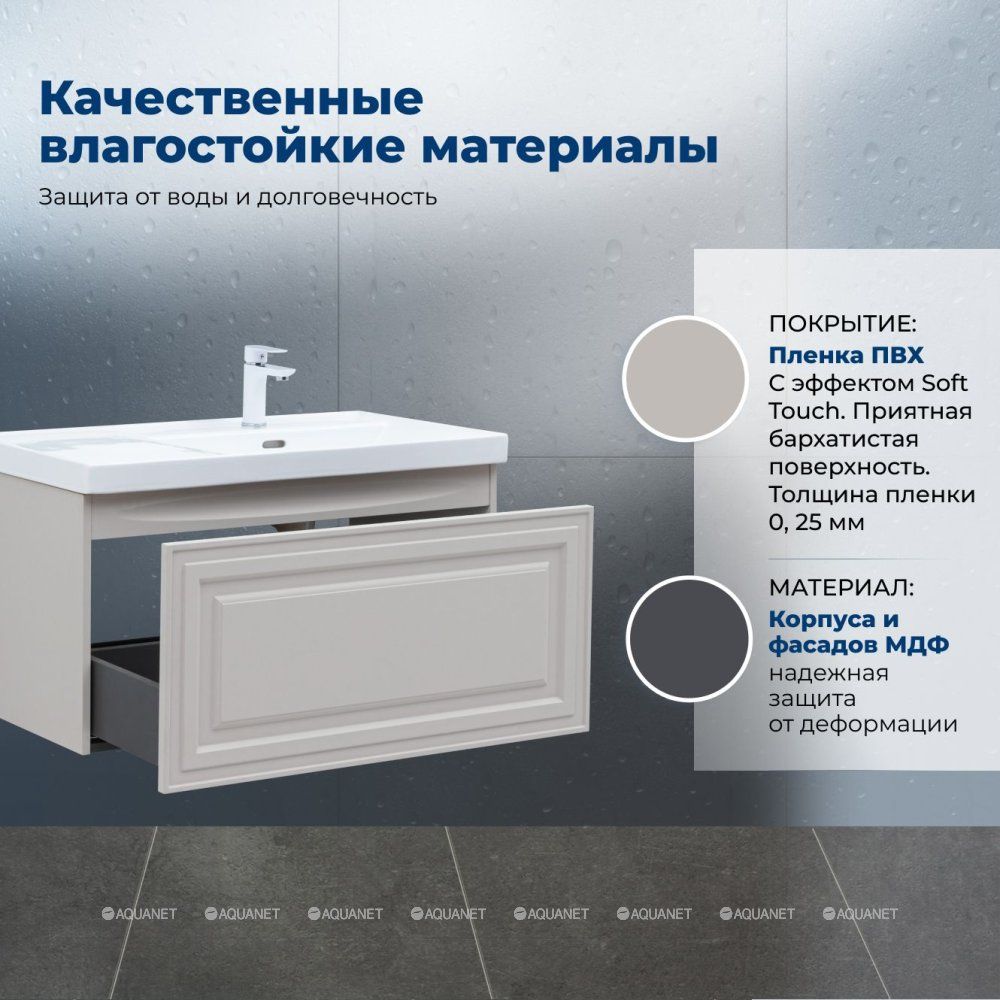 Тумба под раковину Aquanet Агата 100 бежевый — практичное и стильное решение для ванной комнаты. Корпус и фасады изготовлены из МДФ с покрытием пленкой ПВХ. Пленка имеет эффект Soft touch, создавая приятную бархатистую поверхность. Она устойчива к царапинам и влаге, сохраняя внешний вид надолго.