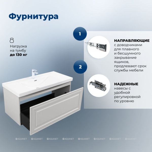Навесы тумбы выдерживают нагрузку до 130 кг. Это делает конструкцию долговечной. За нижним ящиком предусмотрено место для подводки коммуникаций снизу. Это упрощает монтаж и эксплуатацию.