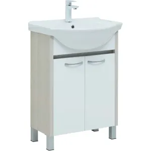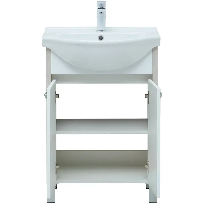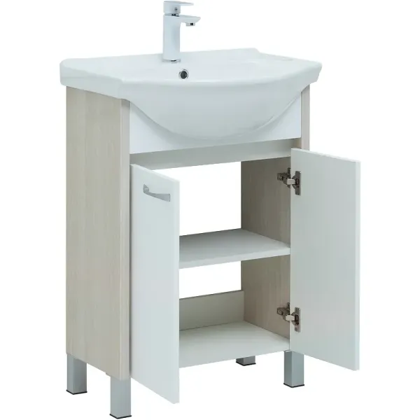 Тумба под раковину Aquanet «Донна» 60 оснащена двумя белыми распашными дверцами, за которыми располагается один отсек с полкой. Удобство открывания обеспечивают хромированные ручки. Корпус сделан из ЛДСП, окрашенной в цвет «белый дуб». Модель устанавливают на четыре ножки.