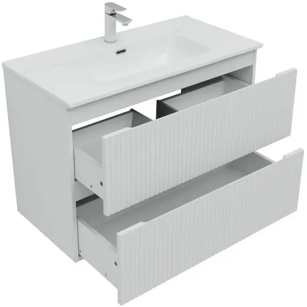 Тумба под раковину Aquanet Джейн (Flat) 90 белый матовый — практичное и стильное решение для ванной комнаты. Корпус и фасады изготовлены из МДФ, покрытого суперматовой пленкой ПВХ повышенной прочности с эффектом «Soft touch». Покрытие не только приятное на ощупь, но и надежно защищает мебель от влаги. Полимерная структура пленки не пропускает воду, поэтому тумба не деформируется со временем и сохраняет первоначальный вид.