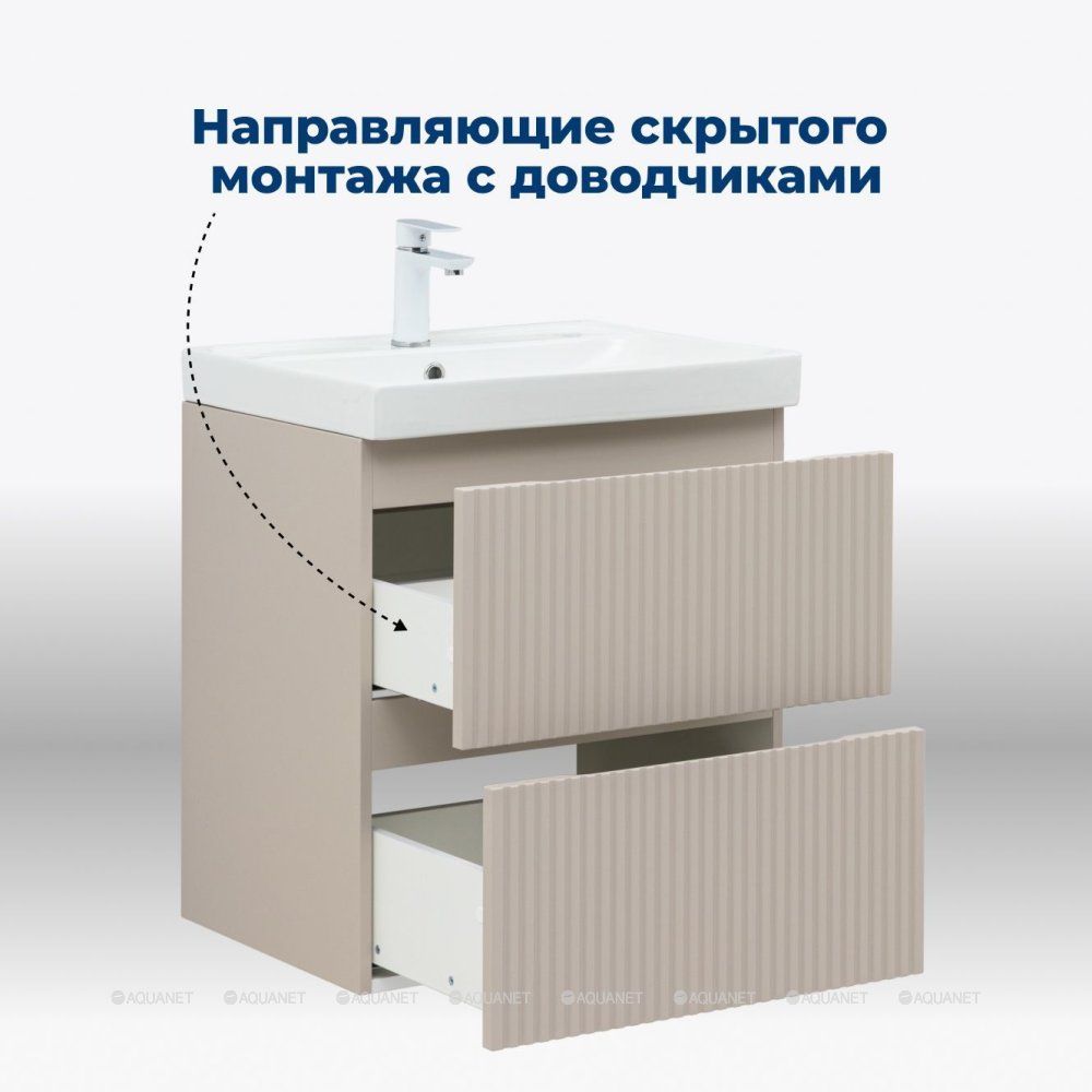 Тумба под раковину Aquanet Джейн (Flat) 60 бежевый сочетает в себе функциональность, прочность и современный дизайн. Подходит для помещений с повышенной влажностью.