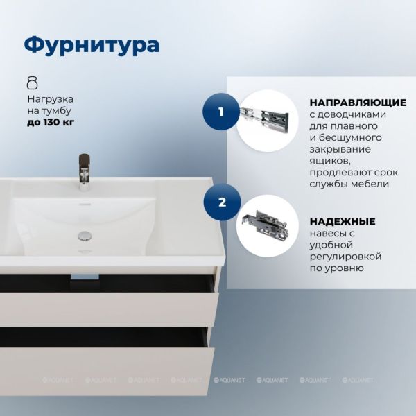 Корпус и фасады изготовлены из влагостойкой ЛДСП с эмалевым покрытием, что обеспечивает устойчивость к влаге и долговечность. Внутренние детали выполнены в цвете антрацит, создавая гармоничный контраст.