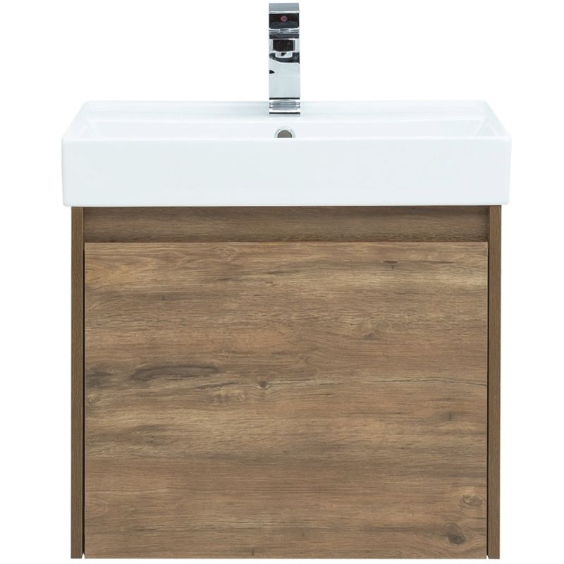 Тумба под раковину Aquanet Nova Lite 60 из влагостойкой ламинированной древесно-стружечной плиты в изысканном цвете «дуб рустикальный» имеет достойный вид. Фактура натурального дерева выглядит благородно, а подвесной монтаж придает визуальную легкость тумбе шириной 60 см. Она оборудована одним ящиком, при открывании которого обнаруживается еще один небольшой для мелочей. Фасад выполнен с декоративной интегрированной ручкой, не имеющей острых краев и внутренних углов, что обеспечивает удобство в эксплуатации и легкий уход за мебелью. Направляющие с доводчиками, так что при открывании и закрывании ящикам обеспечен плавный ход и отсутствие неприятных стуков. Неглубокая и стильная керамическая раковина «Латина» идеально подходит к тумбе.