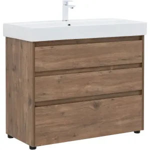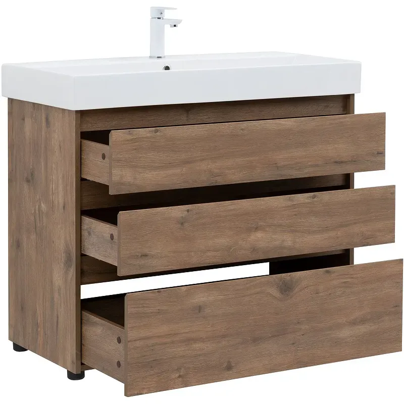 Тумба под раковину Aquanet Nova Lite 100 в дубово-рустикальном исполнении — идеальный вариант для дополнения ванной комнаты в любом из современных стилей. Лаконичный дизайн с претензией на натуральность позволяет освежить санузел смелым решением. Компактные размеры 982*825*450 мм подойдут как для малых помещений, так и для просторных. Напольная модель оснащена ножками и тремя выдвижными шкафами. Пространство внутри организовано для хранения вещей и бытовой химии с учетом коммуникаций для водоотведения. Корпус и фасад мебели изготовлены из влагостойкого ЛДСП, который препятствует образованию плесени и грибка при длительном взаимодействии с водой и влажным воздухом. Выдвижные шкафы оснащены механизмом доведения, что обеспечивает плавное закрытие. В комплект к тумбе можно купить подходящую по размерам керамическую раковину от Sanovit, например модель Slim Synergy, которая легко подсоединяется к мебели.