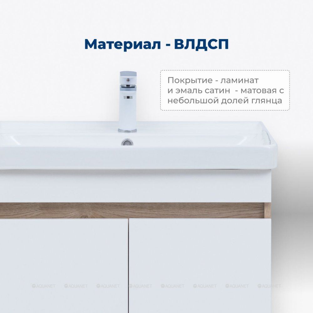 Корпус тумбы выполнен из влагостойкой ЛДСП с ламинированным покрытием, что гарантирует долговечность и устойчивость к воздействию влаги. Фасады также изготовлены из влагостойкой ЛДСП, обеспечивая единый стиль и надежную защиту от деформации.