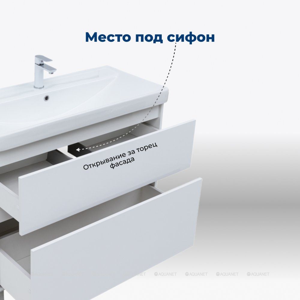 Пластиковое ограждение сифона в сером цвете аккуратно скрывает коммуникации. Прочное дно нижнего ящика, изготовленное из влагостойкой ЛДСП толщиной 16 мм, позволяет хранить даже тяжелые предметы. Предусмотренное место за нижним ящиком для подводки коммуникаций снизу упрощает монтаж и подключение сантехники. Aquanet Вега 80 – это оптимальное решение для создания стильного и практичного интерьера ванной комнаты.