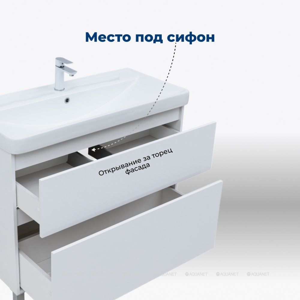 Пластиковое ограждение сифона в сером цвете аккуратно скрывает коммуникации. Прочное дно нижнего ящика, изготовленное из влагостойкой ЛДСП толщиной 16 мм, позволяет хранить даже тяжелые предметы. Предусмотренное место за нижним ящиком для подводки коммуникаций снизу упрощает монтаж и подключение сантехники. Aquanet Вега 90 – это оптимальное решение для создания стильного и практичного интерьера ванной комнаты.