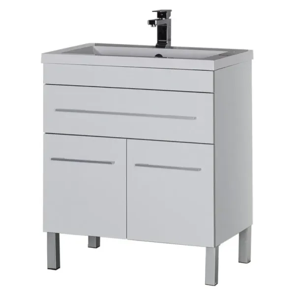 Тумба напольная с раковиной серии Верона с покрытием из качественного акрила — такая отделка придает эффектности внешнему виду и повышает уровень влагозащиты. Применение акрила в производстве мебели для ванных — уникальное предложение, созданное на специализированной линии предприятия. Нейтральный цвет универсален, потому мебель Верона можно совмещать с любыми оттенками в интерьере и разнообразием креативных идей. Экстравагантная геометричность формы подчеркнута горизонтальными линиями фурнитуры ручек выдвижных ящиков. Их вместительное пространство обеспечит дополнительное место хранения банных принадлежностей.