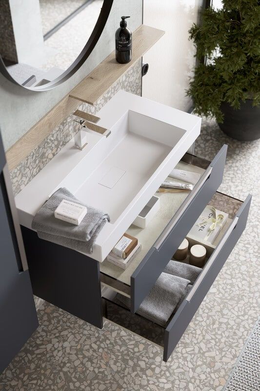 Подвесная тумба в сером матовом цвете с двумя ящиками под умывальник из литьевого мрамора.Коллекция мебели Cube – это строгие линии мебели для современных интерьеров, подчёркнутые искусным исполнением. Подвесные гарнитуры Cube поставляются в размерах 70 и 90 см. Доступные цвета мебели – белый и серый. Финальный слой лака – матовый.