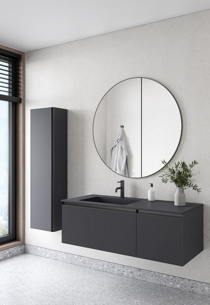 Главной особенностью коллекции являются обрамления фасадов из алюминия в самых трендовых цветах: графит, матовое золото, матовый черный и серебро. Эти обрамления идеально дополняют сантехнику в ванной комнате.