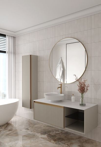 Главной особенностью коллекции являются обрамления фасадов из алюминия в самых трендовых цветах: графит, матовое золото, матовый черный и серебро. Эти обрамления идеально дополняют сантехнику в ванной комнате.