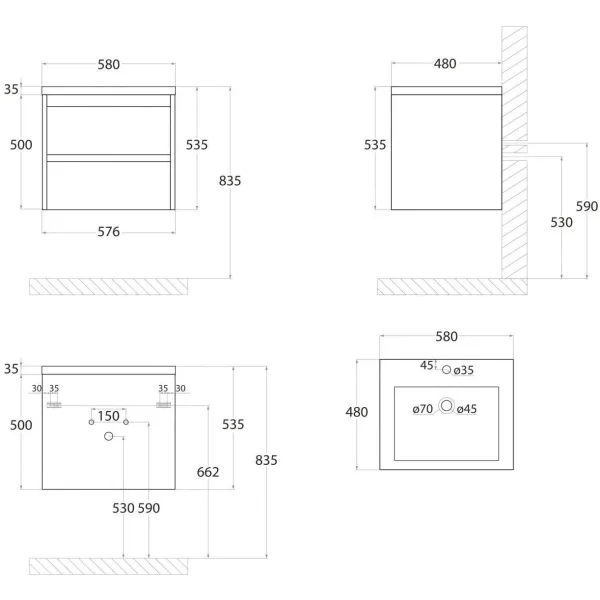 FAMILY-M База под раковину подвесная с двумя выкатными ящиками, Hard Coal, 580x480x550, Family-M-580-2C-SO-HC