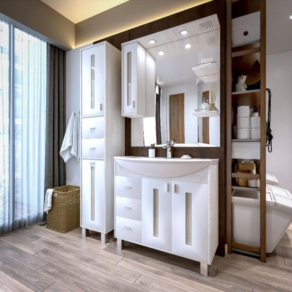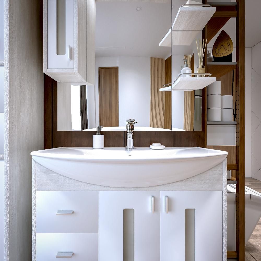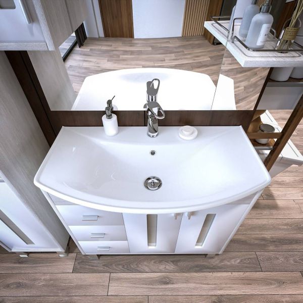 Удобная система хранения позволяет размещать все необходимое для гигиенических процедур, а её продуманные размеры отлично вписываются даже в небольшие помещения. Стильные ручки и элегантные фасады придают тумбе особый шарм, а разнообразие цветовых решений позволит выбрать модель, соответствующую любому интерьеру – от классического до модерн.