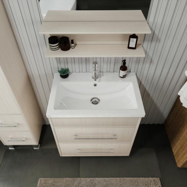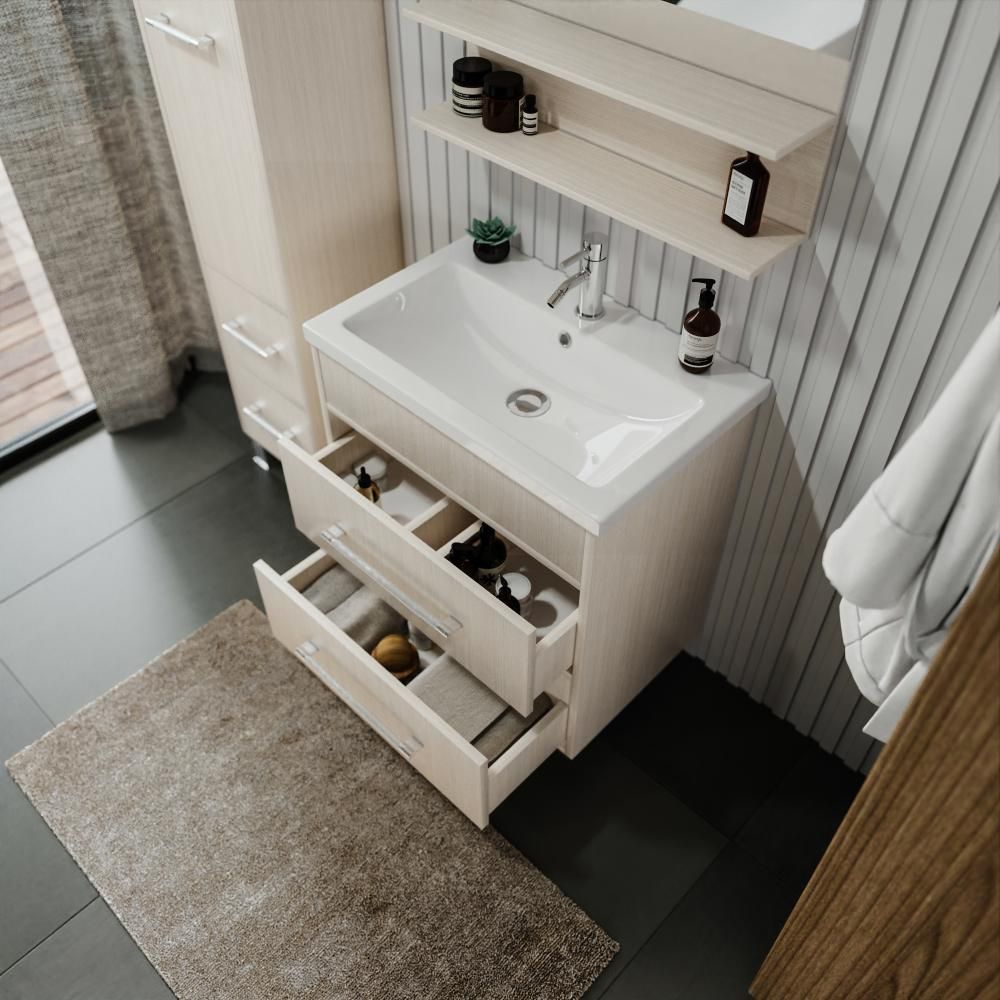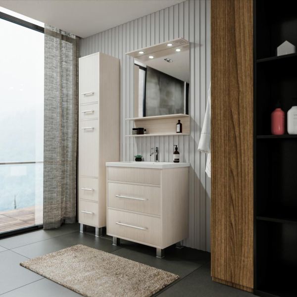 Удобная система хранения позволяет размещать все необходимое для гигиенических процедур, а её продуманные размеры отлично вписываются даже в небольшие помещения. Стильные ручки и элегантные фасады придают тумбе особый шарм, а разнообразие цветовых решений позволит выбрать модель, соответствующую любому интерьеру – от классического до модерн.